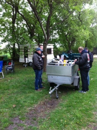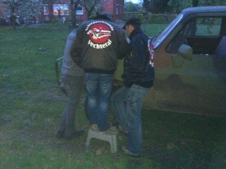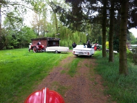 Am nächsten Morgen fuhren wir über Lindloh und Fehndorf durchs Veen bis uns die dunklen Wolken verrieten, dass wir unseren alten Gefährten lieber eine Strecke Vollgas zugestehen sollten. Triefend Nass pellten wir uns in Twist Bült aus unseren Regenklamotten und ließen uns in einem Imbiss die Hamburger und Schnitzel schmecken, ehe sich die Wege der Osterwalder Jungs und der Emmelkamper trennten und wir die letzten Kilometer angingen. Leider hat es uns auf den letzten Kilometer noch einmal richtig erwischt. Alwins Kupplung war in Schoonebeek defekt und zum Zielfoto kamen dann passend die Blitze vom Himmel.
