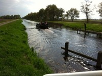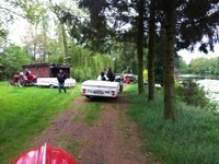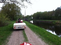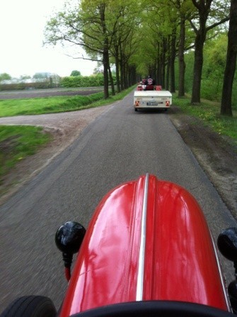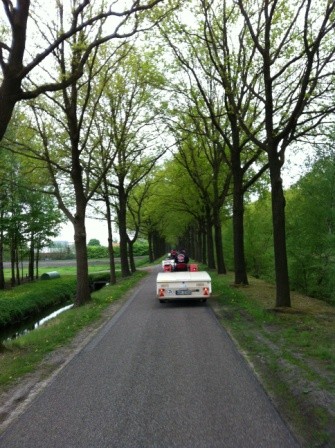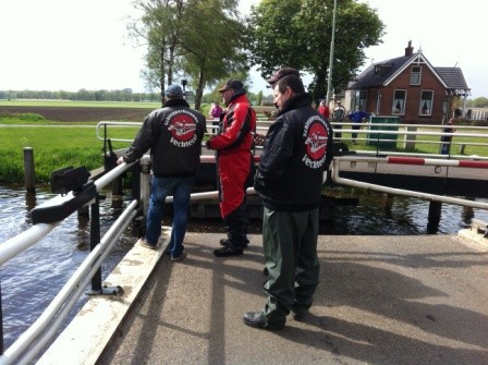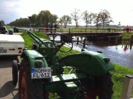 Um kurz vor 11 machten wir uns am Freitag auf den Weg nach Papenburg. Leider war wegen der Frühjahrkirmes und das besser werdende Wetters mittags so viel los, dass wir in der Stadt eine riesige Blechlawine hinter unserem Konvoi herzogen. Wir fütterten unsere Oldies mit etwas Diesel entledigten uns dessen was Männer nach einer durstigen Nacht so loswerden wollen. (Bis Detlef die Tür zugeschlagen hatte) und zogen von dannen, Richtung holländische Grenze, über die Ems, Richtung Vlaggtwedde (NL). Leider ist das Emsland westlich der A31 und vor der holländischen Grenze so was von trostlos langweilig, das wir uns von den Millionen von Grashalmen und Wiesen und den tausenden von Weissbunten verabschiedeten und entlang der holländischen Kanäle die Alleen und Schwänkbrücken genossen und das ältere Pärchen, das mit seinem Kutter immer wieder an uns heran rückte.